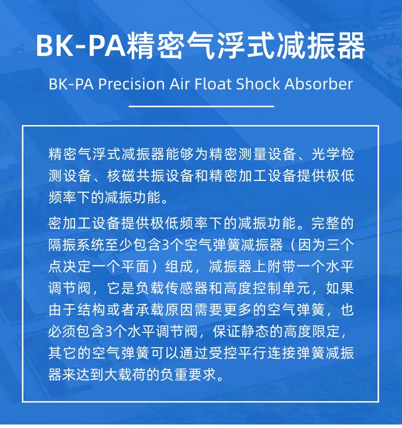 →BK-PA精密氣浮減振器能夠為計量器具,電子顯微鏡,核磁共振設備,測量三坐標和精密加工設備提供低頻率下的減振功能?!鶥K-PA的精密氣浮減振系統(tǒng)采用伺服控制的空氣彈簧。在需要同時控制高度和振動的條件下,這種減振器是非常理想的?!鶥K-PA精密氣浮減振器滿足了計量器具,電子顯微鏡,檢測設備和精密加工設備的嚴格要求。
